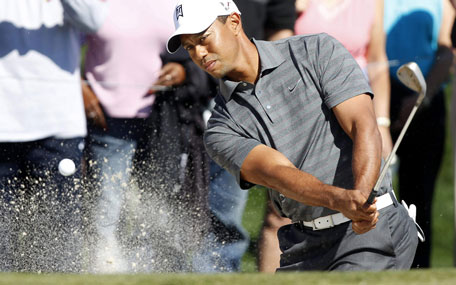 Tiger Woods hits from the sand on the second hole during a practice round for the WGC Accenture Matchplay Championships tournament in Marana, Arizona on Tuesday. (REUTERS)