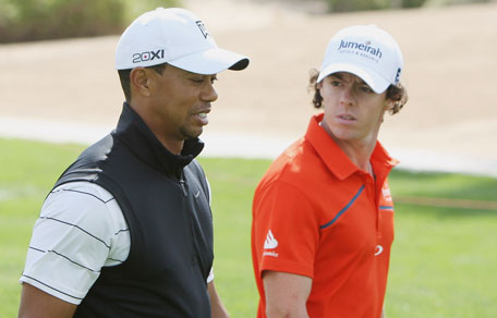 Tiger Woods (left) walks alongside Rory McIlroy during a practice round prior to the start of the Abu Dhabi HSBC Golf Championship at the Abu Dhabi Golf Club on Tuesday in Abu Dhabi. (GETTY)