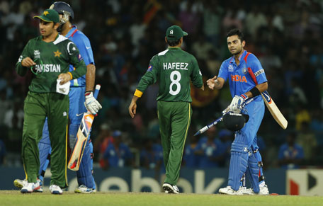 India's batsmen Virat Kohli, right, shakes hands with Pakistan's captain Mohammad Hafeez after beating them by 8 wickets in the ICC Twenty20 Cricket World Cup Super Eight match between India and Pakistan in Colombo, Sri Lanka, Sunday, Sept. 30, 2012. (AP)