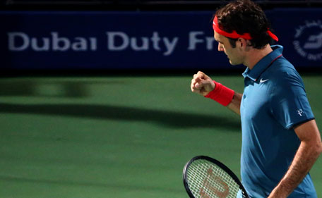 Roger Federer of Switzerland celebrates after winning against Radek Stepanek of Czech Republic on the third day of the ATP Dubai Duty Free Tennis Championships on February 26, 2014 in Dubai. (AFP)