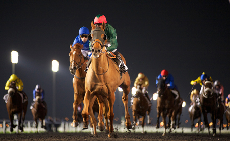 Adrie De Vries picks up the spare ride on Emirates Flyer, fifth in the first round of the Al Maktoum Challenge on the first night of the Dubai World Cup Carnival.