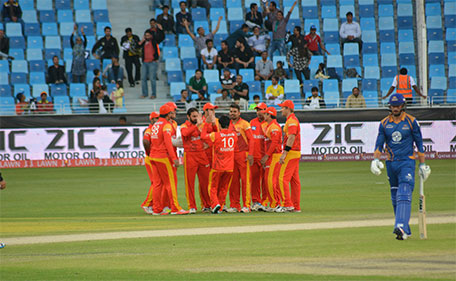 Riaz has the last laugh after being hit for a boundary by Nawaz. Gladiators 79-4, 11.5 overs.