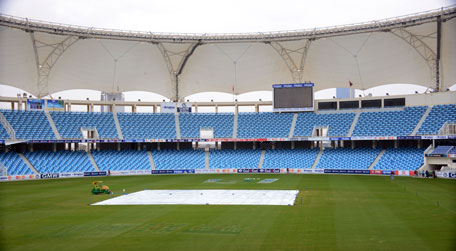 The wicket was covered after persistent rain before the second Test between Pakistan and Sri Lanka at Dubai International Stadium on January 7, 2104. (KAMAL JAYAMANNE)