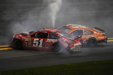 Michael Annett, driver of the #7 Pilot/Flying J Travel Centers Chevrolet, spins next to Kasey Kahne, driver of the #5 Farmers Insurance Chevrolet, during the NASCAR Sprint Cup Series Daytona 500 at Daytona International Speedway. (AFP)