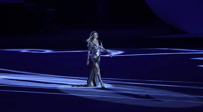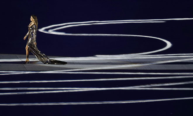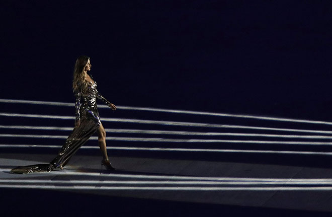 Model Gisele Bundchen walks on stage as 'The Girl from Ipanema' during the opening ceremony for the 2016 Summer Olympics in Rio de Janeiro, Brazil, Friday, Aug. 5, 2016. (AP)