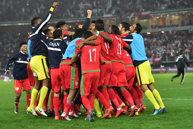 Oman's players celebrate after winning the Gulf Cup of Nations 2017 final football match between Oman and the UAE at the Sheikh Jaber al-Ahmad Stadium in Kuwait. (AFP)