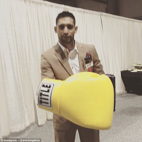 Amir Khan posing with giant, yellow-padded gloves in this picture uploaded on his Instagram account. (@amirkingkhan)