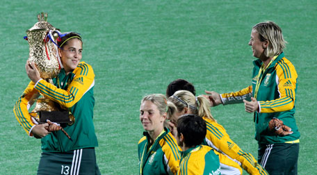South Africa's Lisa-Marie Deetlefs holds the trophy as she celebrates with teammates after they won their London 2012 Olympic Games women's field hockey final qualifying match against India in New Delhi on Saturday. (REUTERS)