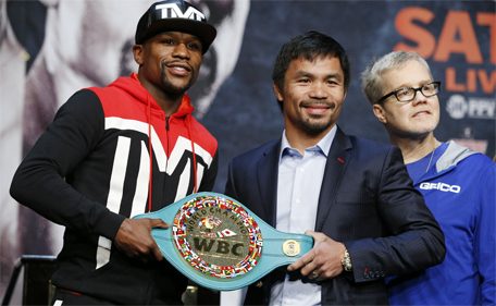 Boxers Floyd Mayweather Jr (left) and Manny Pacquiao pose with a WBC belt during a press conference Wednesday, April 29, 2015, in Las Vegas. At right is Freddie Roach, Pacquiao's trainer. (AP)
