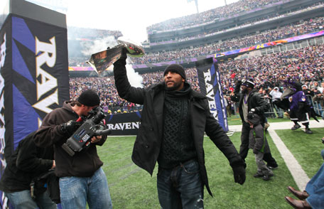 Baltimore Ravens' Ray Lewis holds up the Lombardi Trophy to the cheering crowd at M&T Bank Stadium, during a celebration of the Ravens' win in the NFL football Super Bowl, on Tuesday, Feb. 5, 2013, in Baltimore. (AP)