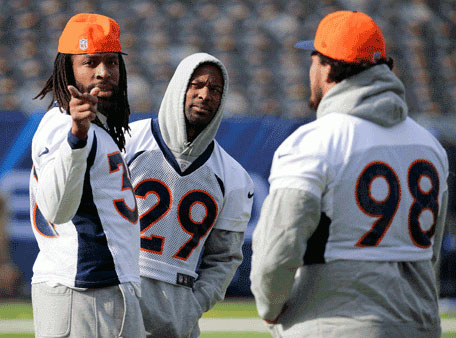 Denver Broncos strong safety David Bruton, free safety Michael Huff (29) and offensive guard Sione Fua (98) look around the field during their "walk-through" session for the NFL Super Bowl XLVIII football game at Met Life Stadium in East Rutherford, New Jersey, February 1, 2014. (REUTERS)