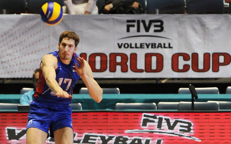 Maxim Mikhaylov of Russia serves the ball at the World Cup men's volleyball tournament in Tokyo. (AFP)