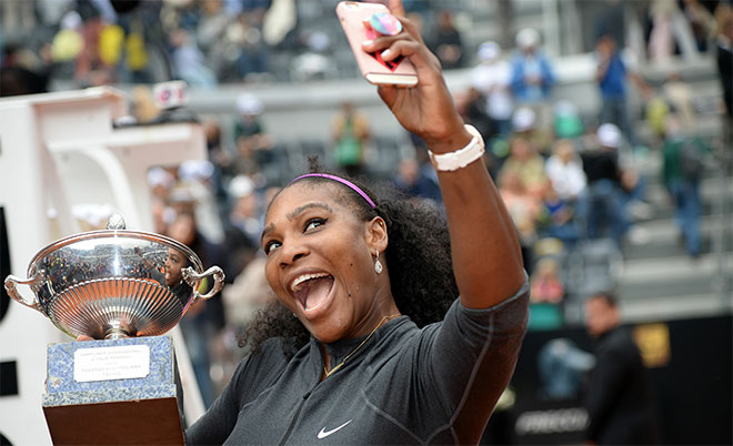 Serena Williams takes a selfie with the trophy after winning the final match of the WTA Tennis Open tournament game against Madison Keys at the Foro Italico in Rome on May 15, 2016. (AFP)