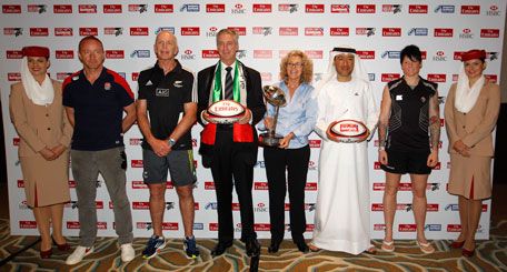 Ben Ryan, England men’s coach, Gordon Tietjens, New Zealand men’s coach, Gary Chapman, Emirates’ President Group Services and dnata, Beth Coalter, Tournament Operations manager IRB, Mohammed AR Falaknaz, Chairman UAERF, and Jen Kish, Canada women’s captain, flanked by Emirates hostesses at the tournament launch on Wednesday. (SUPPLIED)