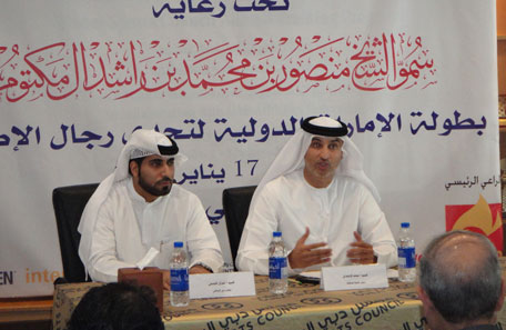 Imran Al Jasmi (left) of Dubai Sports Council and Mohammed Al Ahmadi, chief organiser of UAE International Firefighter Challenge at a press conference in Dubai on Wednesday. (ALLAAM OUSMAN)
