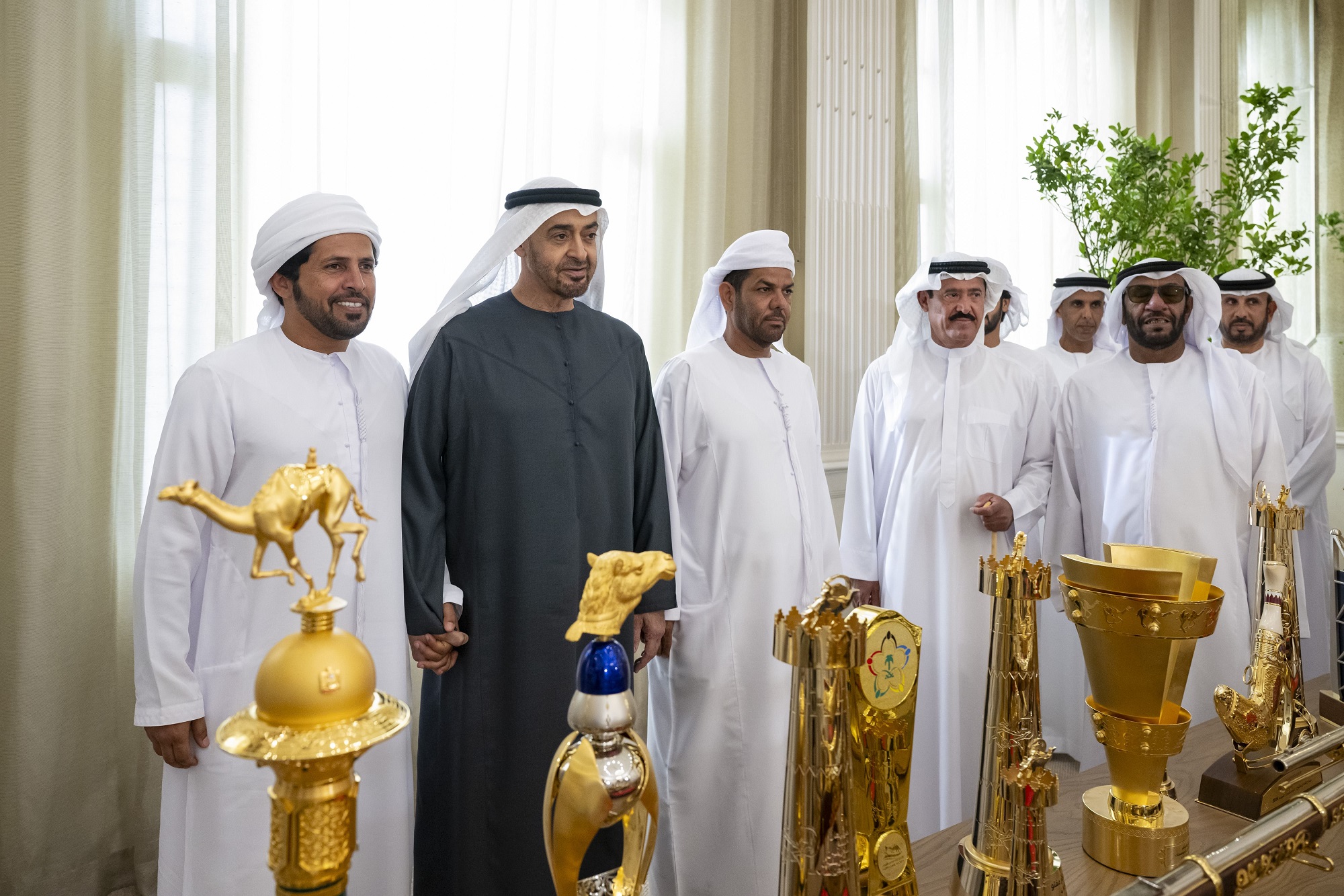 During the reception, which took place at Qasr Al Bahr in Abu Dhabi, His Highness Sheikh Mohamed, accompanied by Sheikh Sultan bin Hamdan Al Nahyan, Adviser to the UAE President and Chairman of the UAE Camel Racing Federation, was briefed on the achievements of the team during their participation in this season’s festivals and competitions.