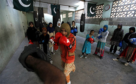 In a dense and dusty neighbourhood in the southern Pakistani city of Karachi, eight young girls lined up against a cement wall, touching their hands to their faces in prayer before boxing practice began.