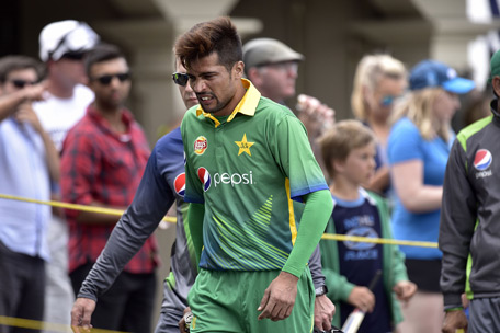 Mohammad Amir of Pakistan walks from the field injured during the first one-day international between New Zealand and Pakistan at the Basin Reserve in Wellington. (AFP)