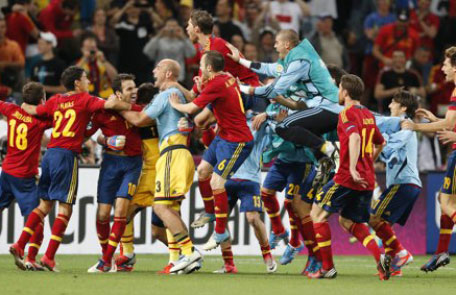 Spanish players celebrate winning the penalty shootout after the Euro 2012 soccer championship semifinal match between Spain and Portugal in Donetsk, Ukraine. (AP)