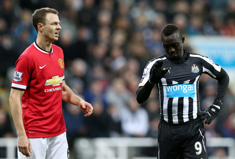 A picture taken on March 4, 2015 shows Manchester United's Northern Irish defender Jonny Evans (L) reacting next to Newcastle United's Senegalese striker Papiss Cisse during the English Premier League football match between Newcastle and Manchester United at St James Park, Newcastle-Upon-Tyne, north east England. The major talking point of the first half at St James' Park was a clash between Newcastle striker Papiss Cisse and United defender Jonny Evans that may prompt disciplinary action from the Football Association. Evans seemed to spit towards the floor after a tussle with Cisse, who appeared to react by spitting at the Northern Irishman's neck, but referee Anthony Taylor did not take action. (AFP)