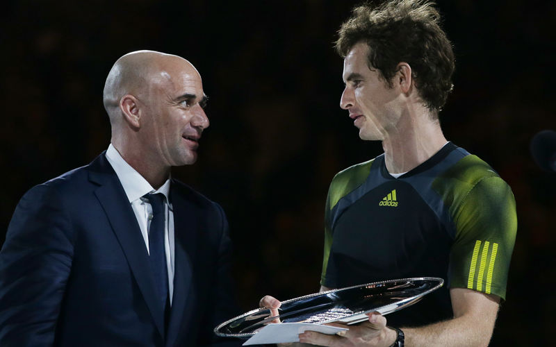 Britain's Andy Murray, right, holds the runner up trophy as he chats with former champion Andre Agassi after Murray's loss to Serbia's Novak Djokovic in the men's final at the Australian Open tennis championship in Melbourne, Australia. (AP)