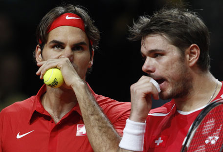 Switzerland's Roger Federer (left) and team member Stanislas Wawrinka react during their Davis Cup doubles match against Mardy Fish and Mike Bryan of the US in Fribourg on Saturday. (REUTERS)
