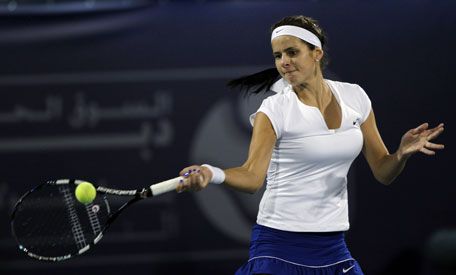Julia Goerges of Germany hits a return to Svetlana Kuznetsova of Russia during their women's singles match at the WTA Dubai Tennis Championships on Monday. (REUTERS)