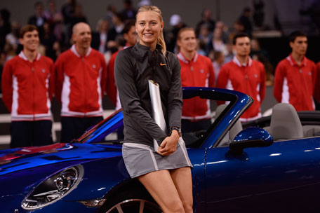 Maria Sharapova of Russia poses with her trophy, a blue Porsche 911 Carrera 4S Cabriolet after winning her final during Day 7 of the Porsche Tennis Grand Prix at Porsche-Arena on April 28, 2013 in Stuttgart, Germany. (GETTY)