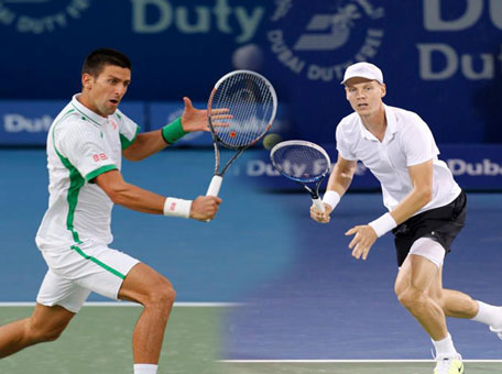 Top-seeded Novak Djokovic rallied past fourth-seeded Juan Martin del Potro 6-3, 7-6 (4) in the first semi-final to reach the DUbai Duty Free Tennis Championship.