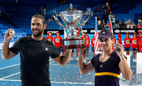 Fernando Verdasco (left) and Anabel Medina Garrigues of Spain hold up the Hopman Cup and their diamond encrusted silver tennis balls after defeating Novak Djokovic and Ana Ivanovic of Serbia in the mixed doubles final during the Hopman Cup tournament in Perth on January 6, 2013. (REUTERS)