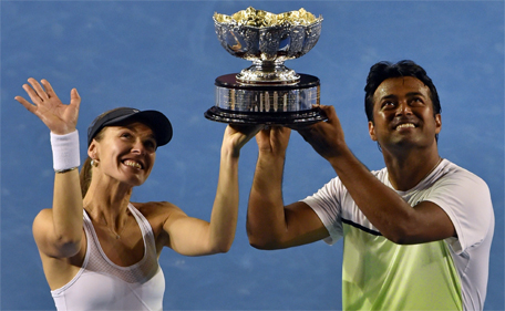 Martina Hingis of Switzerland (left) and Leander Paes of India pose with the winner's trophy at the awards ceremony after their victory over Kristina Mladenovic of France and Daniel Nestor of Canada in their mixed doubles final match on day 14 of the 2015 Australian Open tennis tournament in Melbourne on February 1, 2015. (AFP)