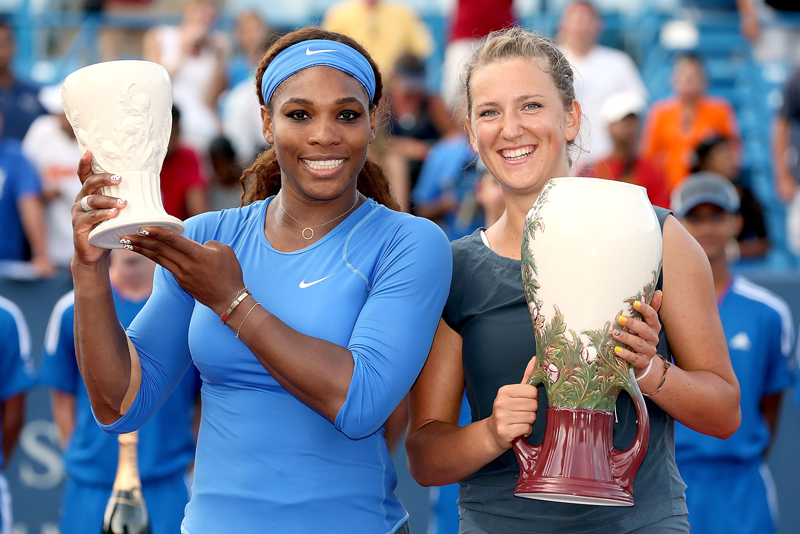 Serena Williams and Victorioa Azarenka of Belarus poses for photographers at the trophy ceremony during the final of the Western & Southern Open on August 18, 2013 at Lindner Family Tennis Center in Cincinnati, Ohio. (Getty Images/AFP)