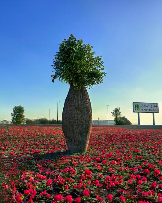 Additionally, the area where Al Meydan and Al Khail Roads intersect will be adorned with ‘Chorisia’ trees (Chorisia Speciosa), marking its inaugural planting in Dubai. This tree, belonging to the mallow family, features a broad, swollen stem that serves as a water reservoir. It also features large pink-red flowers.