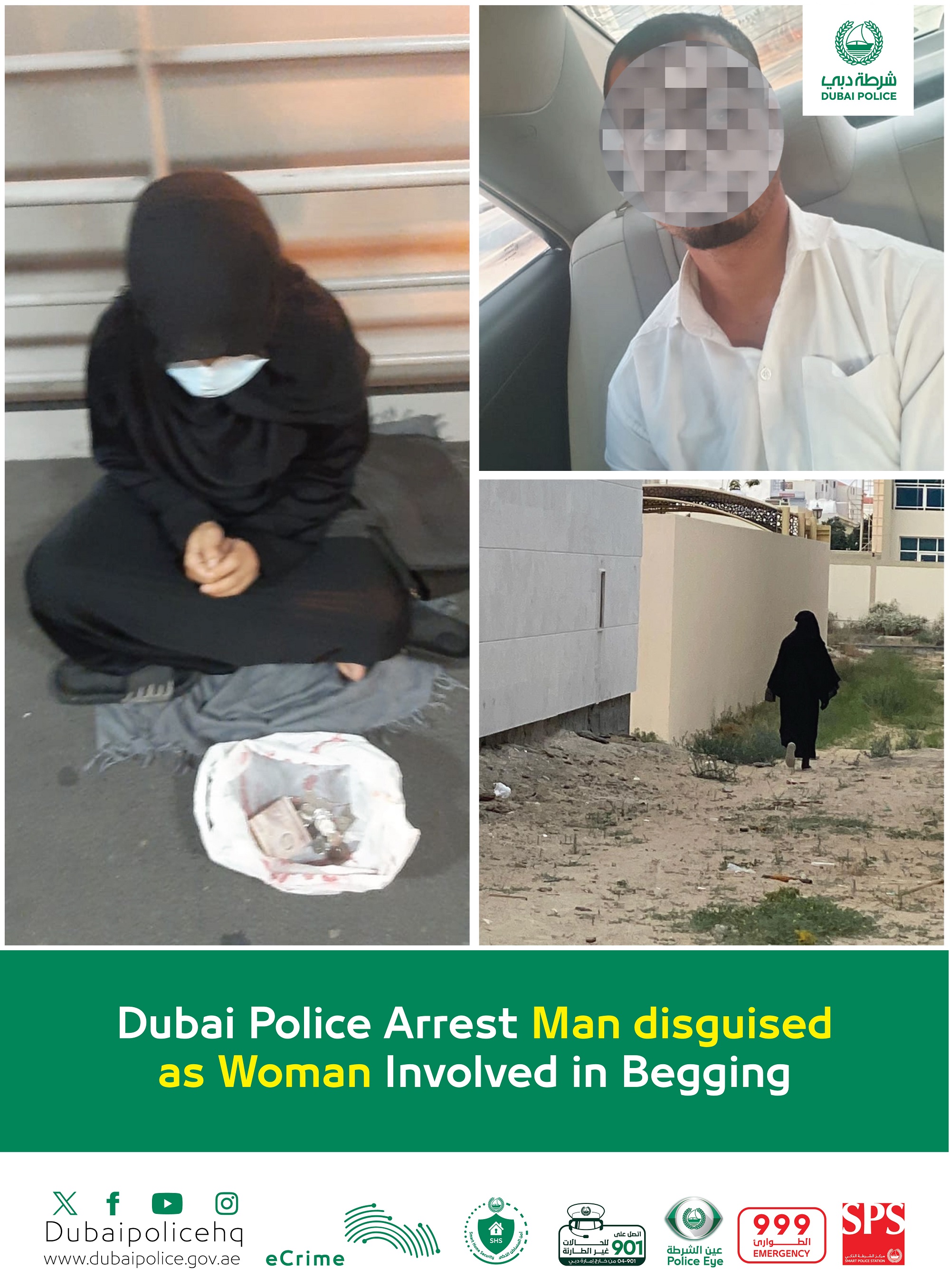 The Department of Suspects and Criminal Phenomena in the General Department of Criminal Investigation of Dubai Police has arrested a young Arab beggar, disguised in women's clothing, "an abaya and niqab," near a mosque.