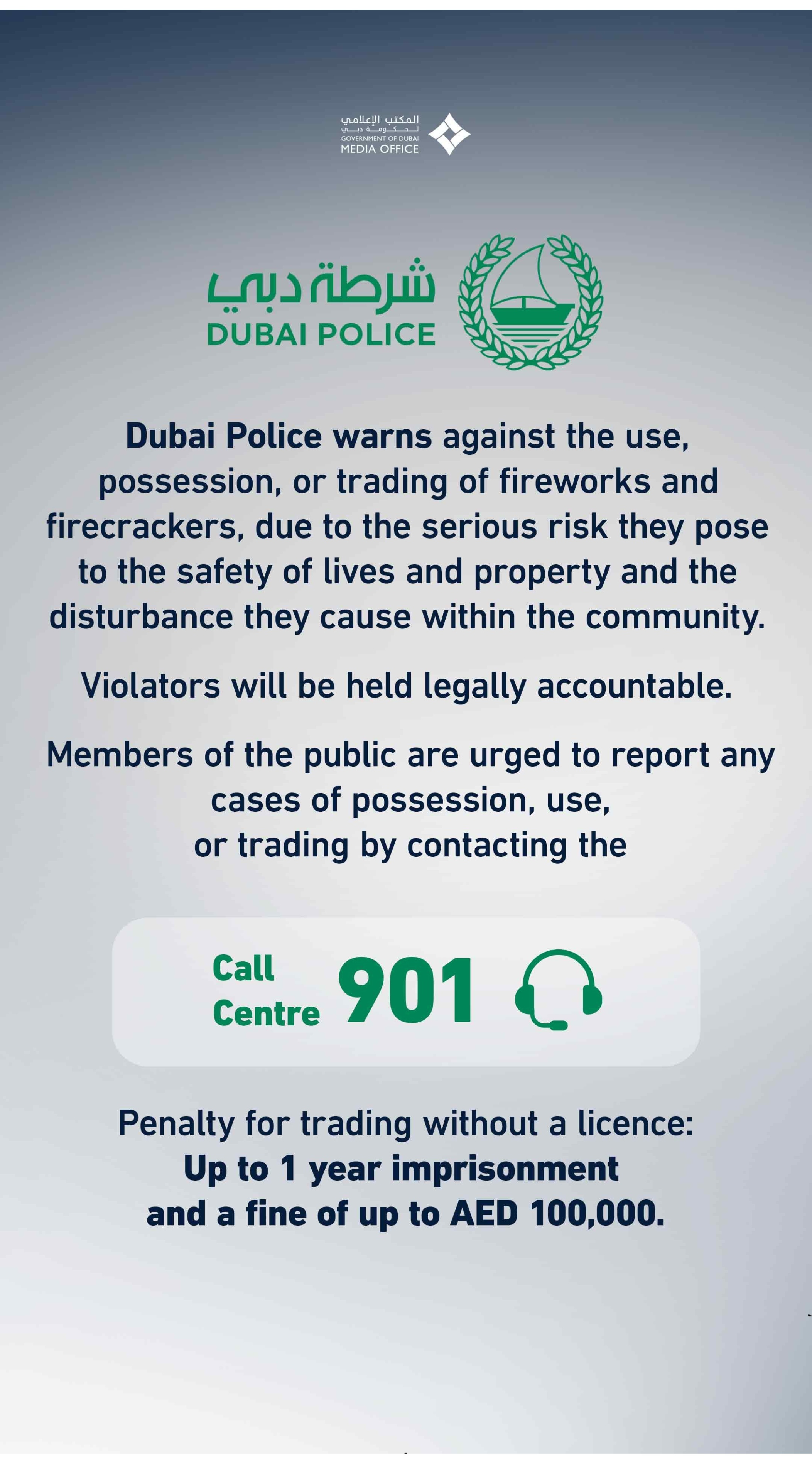 Emirates 24/7 –Dubai Police warns against the use, possession, or trading of fireworks and firecrackers, due to the serious risk they pose to the safety of lives and property and the disturbance they cause within the community.