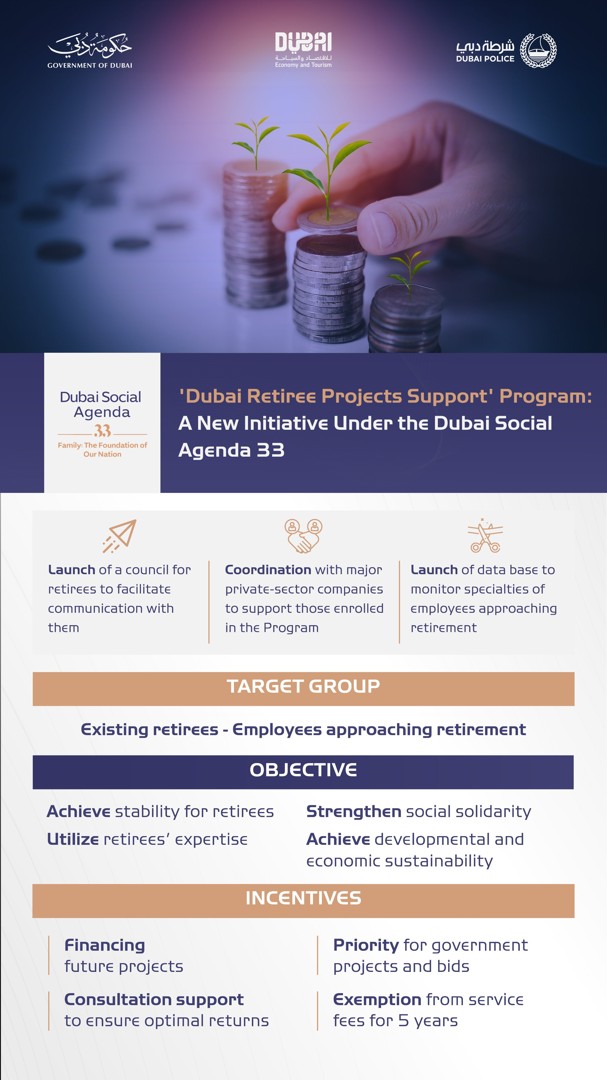 As part of the Dubai Social Agenda 33, launched by His Highness Sheikh Mohammed bin Rashid Al Maktoum, Vice President and Prime Minister of the UAE and Ruler of Dubai, under the theme ‘Family: The Foundation of Our Nation’, the Dubai Police General Command and Dubai's Department of Economy and Tourism – represented by the Mohammed Bin Rashid Establishment for Small and Medium Enterprises (Dubai SME)- signed a memorandum of understanding (MoU) for the launch of the ‘Dubai Retiree Projects Support’ programme, which offers Emirati retirees in Dubai benefits and incentives, including priority in being assigned to government projects, financing of their future projects, exemption from service fees for five years, and consultation support for their projects to ensure optimal returns.