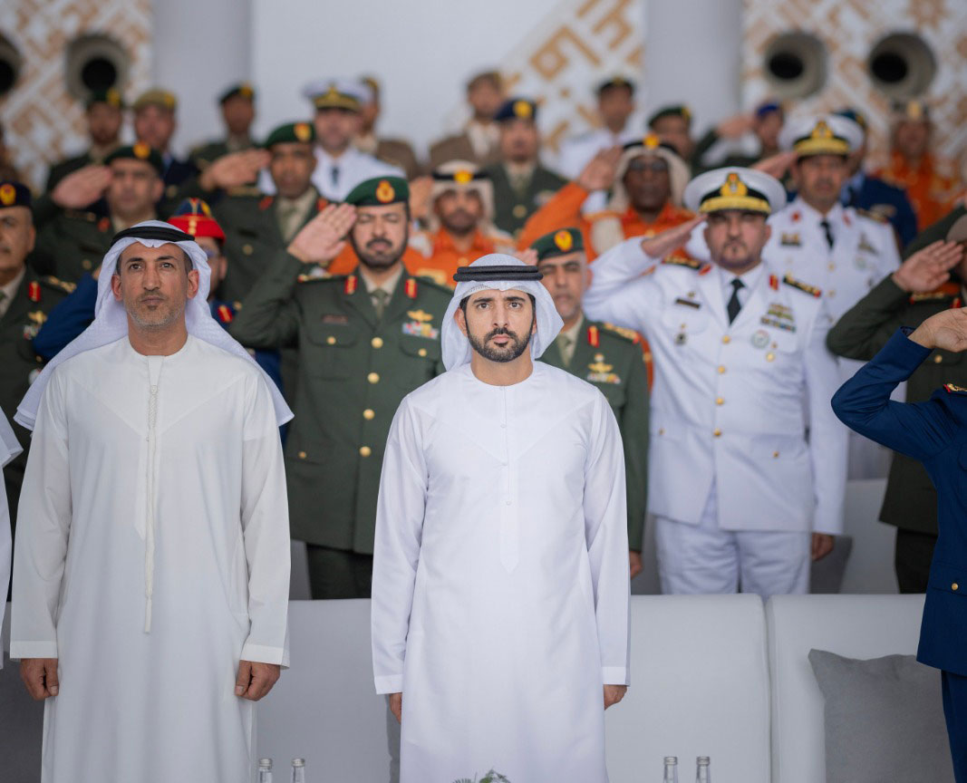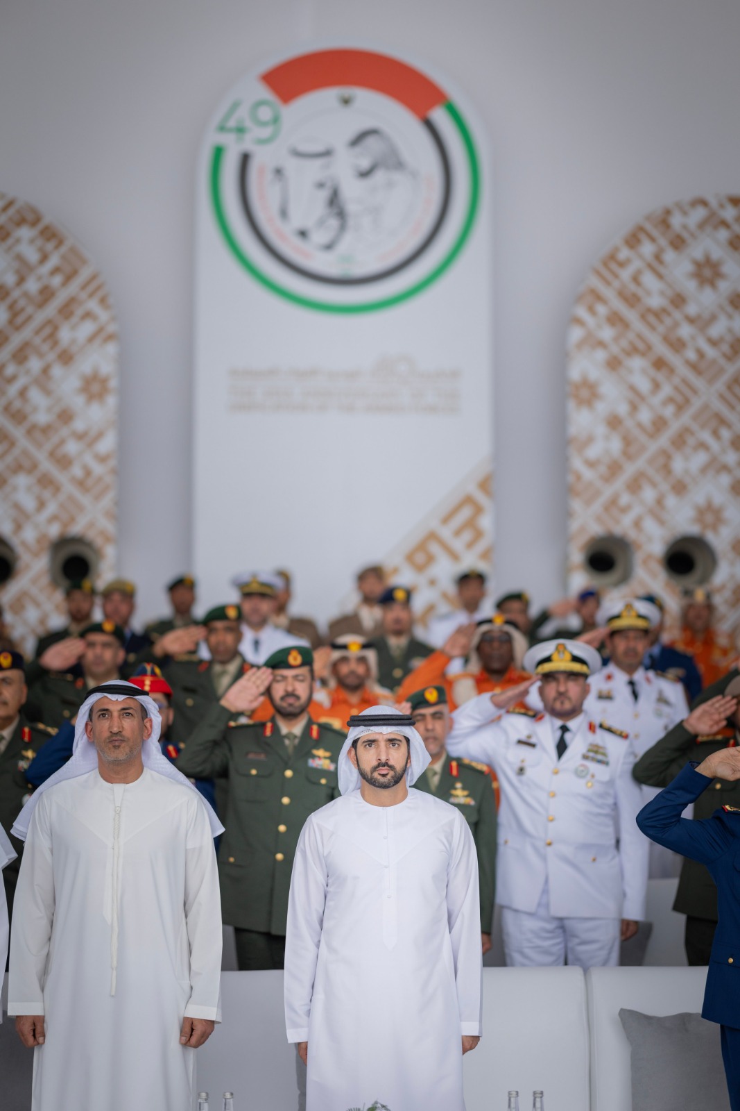 His Highness Sheikh Hamdan bin Mohammed bin Rashid Al Maktoum, Crown Prince of Dubai, Deputy Prime Minister, and Minister of Defence, attended a ceremony held in the Abu Mureikha area in Abu Dhabi to mark the 49th anniversary of the unification of the UAE Armed Forces.