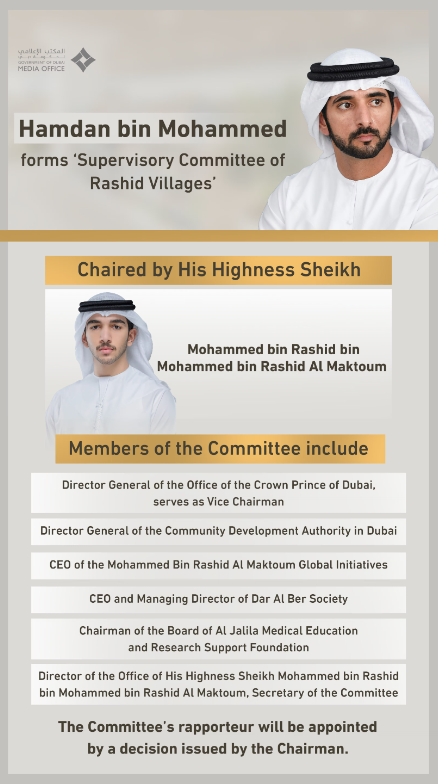 His Highness Sheikh Hamdan bin Mohammed bin Rashid Al Maktoum, Crown Prince of Dubai, Deputy Prime Minister, and Minister of Defence, issued Decision No. (1) of 2026 forming the Supervisory Committee of Rashid Villages, chaired by His Highness Sheikh Mohammed bin Rashid bin Mohammed bin Rashid Al Maktoum.