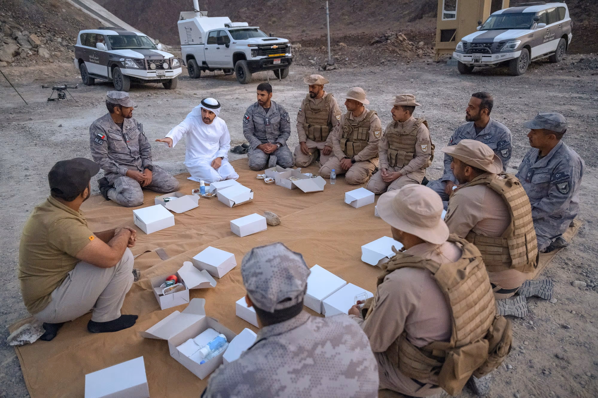 His Highness Sheikh Hamdan bin Mohammed bin Rashid Al Maktoum, Crown Prince of Dubai, Deputy Prime Minister and Minister of Defence of the UAE, and Chairman of The Executive Council of Dubai, joined National Guard personnel engaged in patrolling duties in Hatta, Dubai, for Iftar. His Highness interacted with troops following a tour of the area during which he took stock of the operational aspects of military units posted in the border areas.