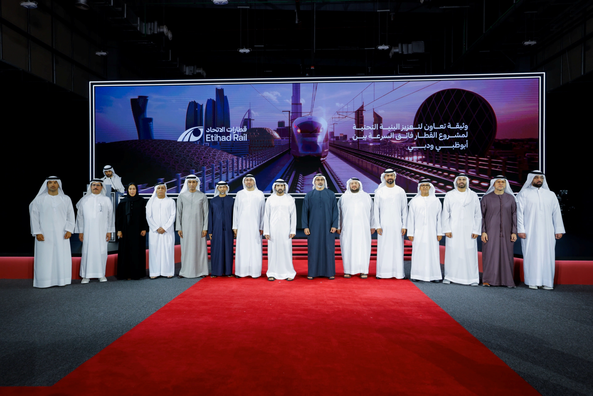 Under the directives of President His Highness Sheikh Mohamed bin Zayed Al Nahyan, H.H. Sheikh Khaled bin Mohamed bin Zayed Al Nahyan, Crown Prince of Abu Dhabi and Chairman of the Abu Dhabi Executive Council, and H.H. Sheikh Hamdan bin Mohammed bin Rashid Al Maktoum, Crown Prince of Dubai, Deputy Prime Minister, Minister of Defence, and Chairman of The Executive Council of Dubai, have witnessed the announcement of a new high-speed train project linking Abu Dhabi and Dubai, in an official ceremony organised by Etihad Rail at Al Faya Depot.