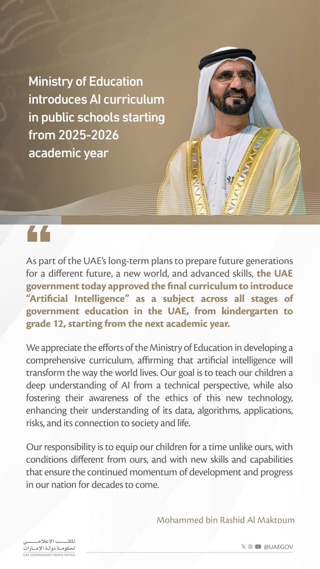 The move will equip students with the essential knowledge and skills required to understand AI concepts and apply them in everyday life, as part of the UAE’s focus on empowering youth to adapt to evolving global trends and drive innovation. It also positions the UAE among the first countries to introduce AI in school curricula.