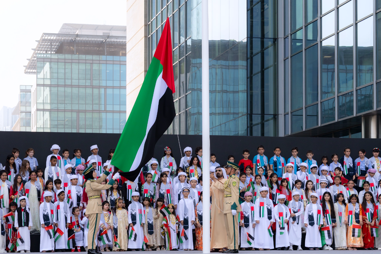 During the ceremony, His Highness, joined by 150 students from schools across Dubai, raised the UAE flag in front of The Gate Building, which featured a striking 15-storey artwork paying tribute to the late Sheikh Zayed bin Sultan Al Nahyan, and the late Sheikh Rashid bin Saeed Al Maktoum during their historic meeting at the late Sheikh Zayed’s farm in Al Khawaneej, Dubai. This image formed the centrepiece of the #ZayedAndRashid campaign, organised by Brand Dubai for the second consecutive year.
