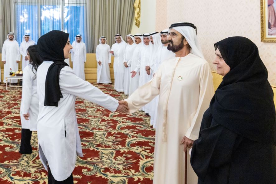 His Highness Sheikh Mohammed bin Rashid Al Maktoum, Vice President, Prime Minister and Ruler of Dubai, met with the top-performing graduates of the Mohammed Bin Rashid University of Medicine and Health Sciences (MBRU) at the Union House in Dubai.