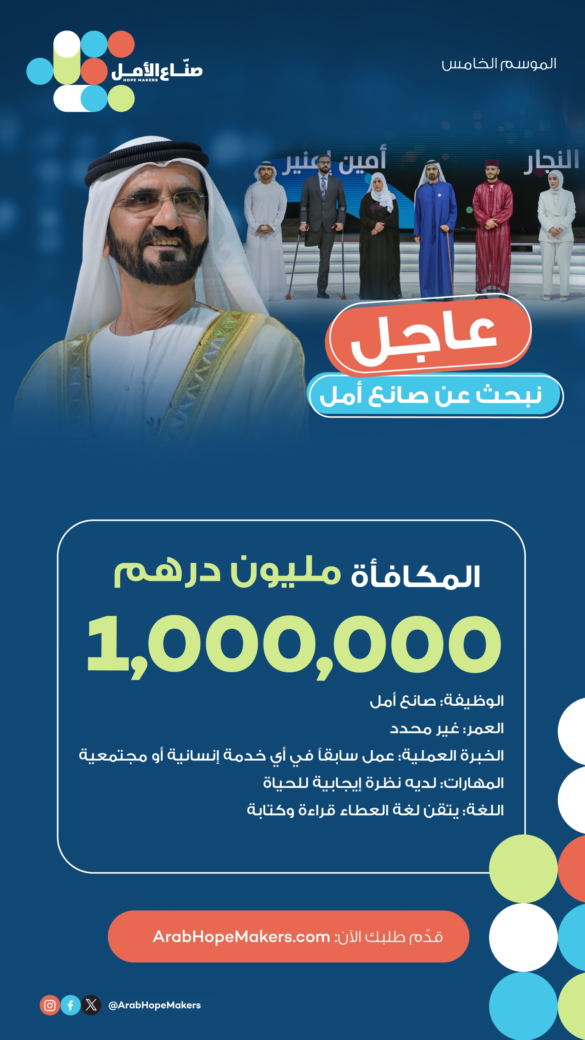His Highness Sheikh Mohammed bin Rashid Al Maktoum has announced the search for Arab Hope Makers for the initiative's fifth edition. This is the largest initiative of its kind in the Arab world, celebrating philanthropists and recognizing their charitable, social, and humanitarian work to improve their communities, help those in need, and create a positive impact by dedicating their resources and capabilities for the greater good.