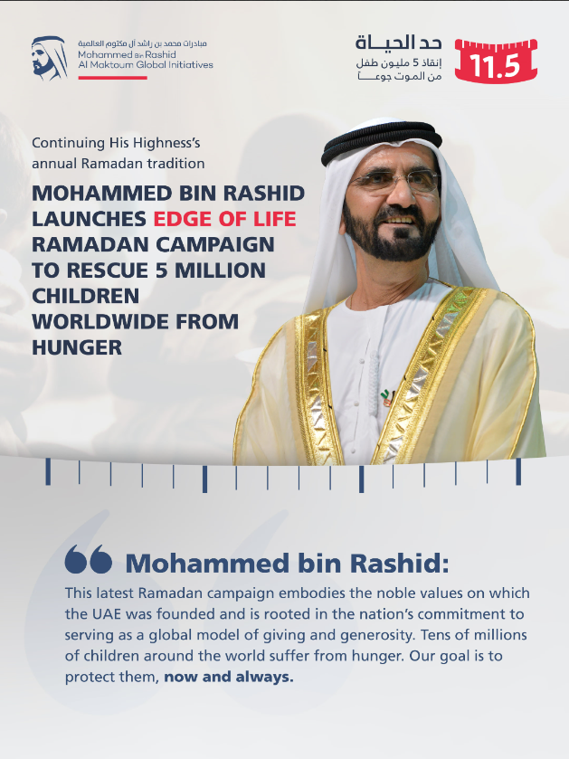 His Highness Sheikh Mohammed bin Rashid Al Maktoum said: “There is no better way to welcome the holy month of Ramadan than by standing in solidarity with humanity, saving lives and ensuring that those in need can live with dignity. This year we launch the Edge of Life campaign to rescue five million children around the world from hunger. Every good act represents a source of power and blessing at once. The UAE continues to lead globally through this humanitarian power, inspired by our long-standing Emirati legacy.”