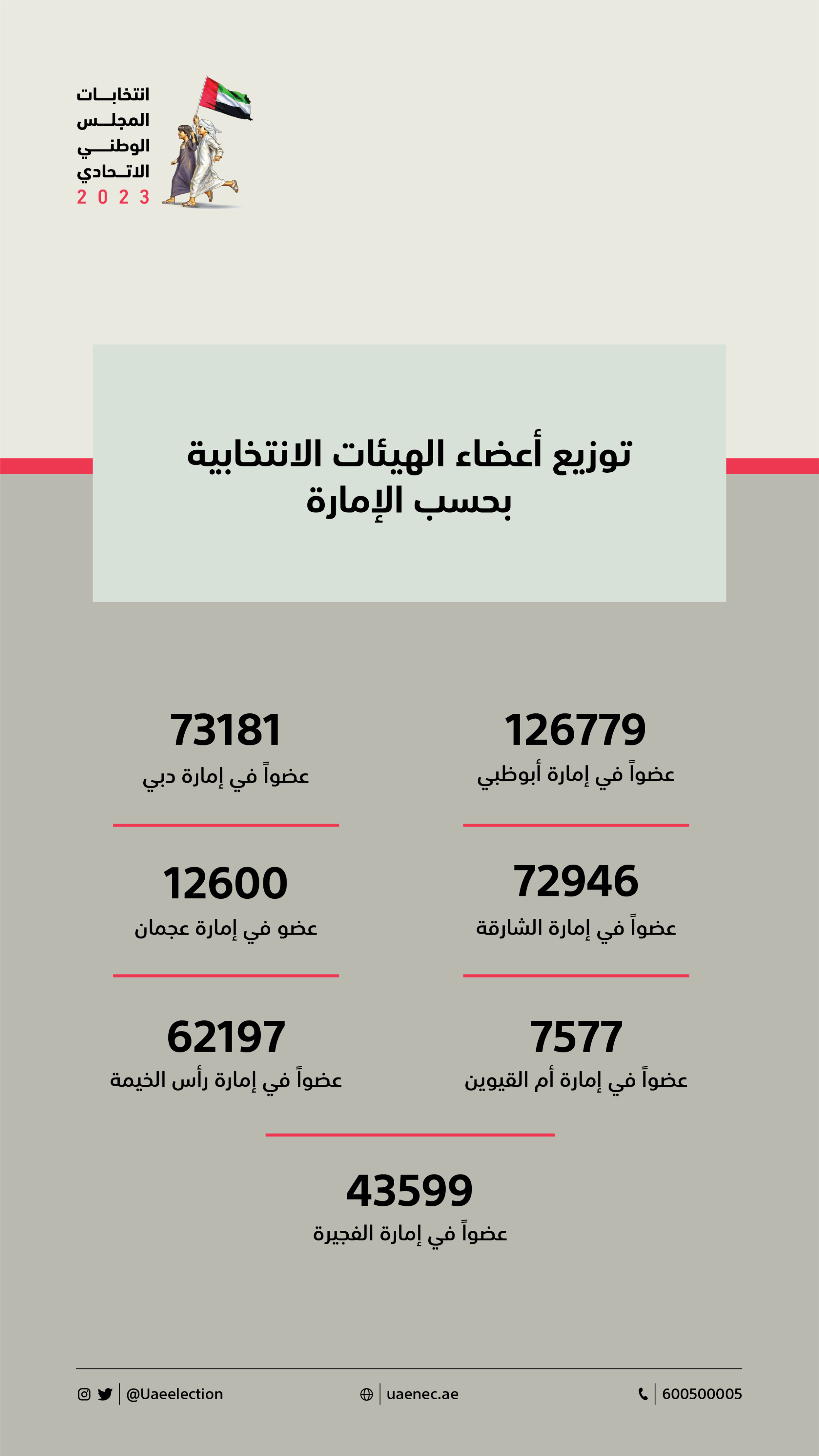 In terms of geographical distribution, 126,779 members originate from Abu Dhabi, 73,181 members from Dubai, 72,946 members from Sharjah, 12,600 members from Ajman, 7,577 members from Umm Al Qaiwain, 62,197 members from of Ras Al Khaimah and 43,559 members are from Fujairah.