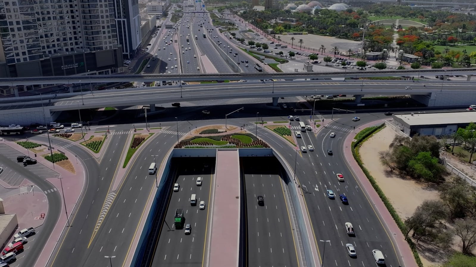 The Falcon Intersection, at Khalid Bin Al Waleed Road and Al Mina Street, consists of three bridges and a tunnel with a total capacity of 28,800 vehicles per hour. The development includes major bridges along Al Khaleej Street and a tunnel for left-turn traffic from Khalid Bin Al Waleed Road to Al Mina Street.