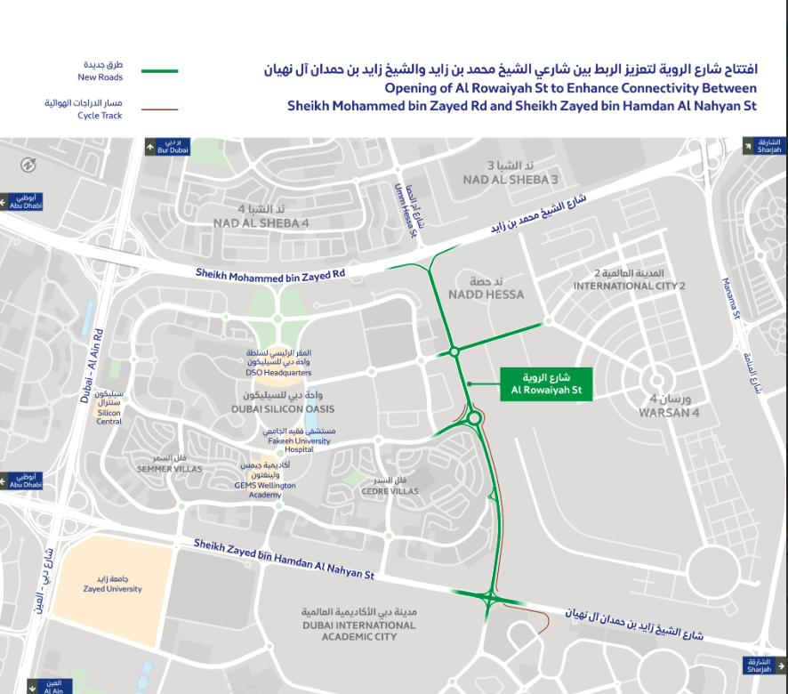Dubai’s Roads and Transport Authority (RTA) has completed Al Rowaiyah Street, extending 3.5 km, directly linking Sheikh Mohammed bin Zayed Road with Sheikh Zayed bin Hamdan Al Nahyan Street near Dubai Silicon Oasis and Nadd Hessa. The project provides direct entry and exit points to both arterial roads, serving Nadd Hessa residential area, Dubai International Academic City, Dubai Silicon Oasis and Warsan 4.