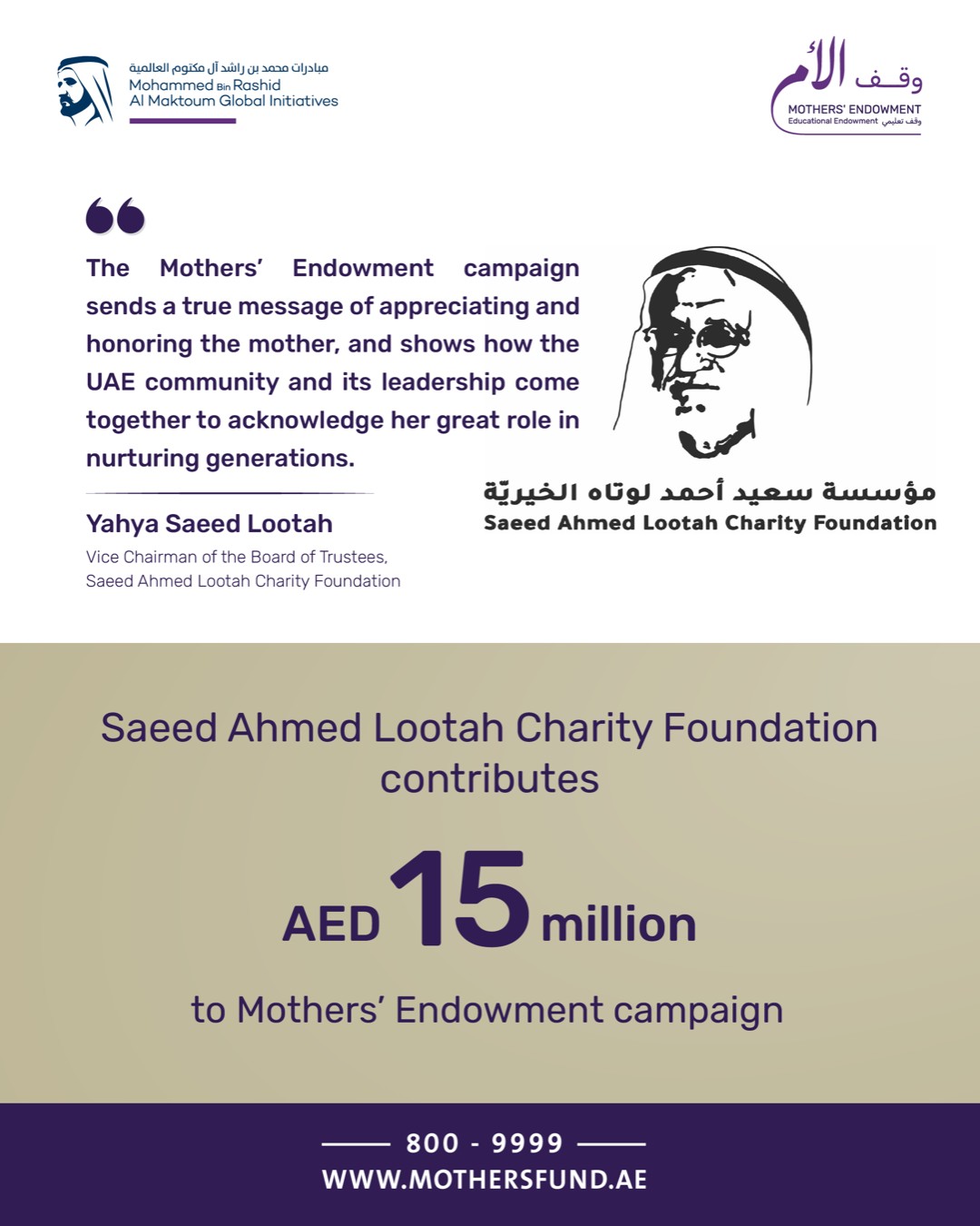 Saeed Ahmed Lootah Charity Foundation announced it will contribute AED 15 million in support of the Mothers’ Endowment campaign, launched by His Highness Sheikh Mohammed bin Rashid Al Maktoum, Vice President and Prime Minister of the UAE and Ruler of Dubai, to honor mothers by establishing a AED 1 billion endowment fund that supports the education of millions around the world.