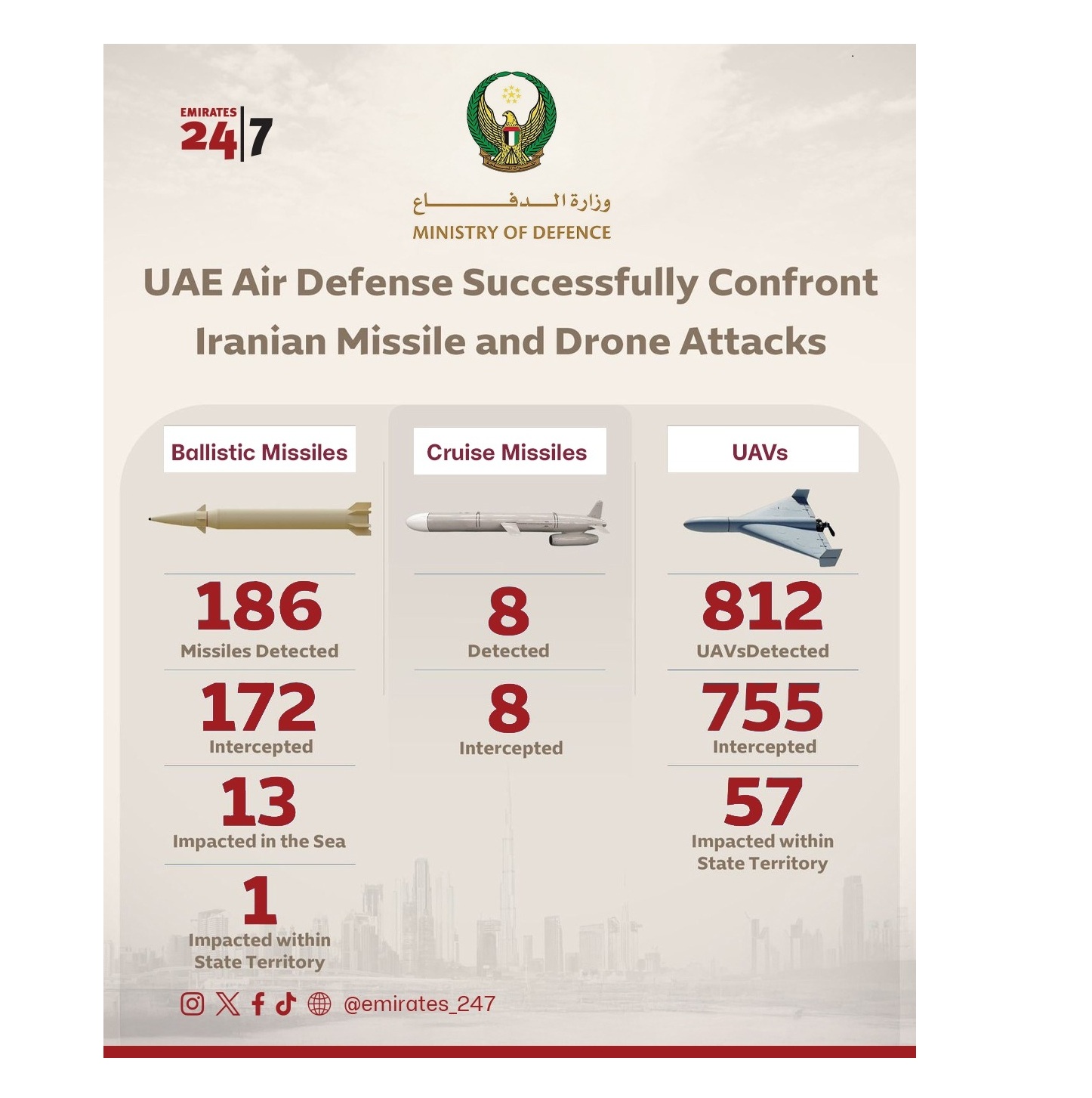 The UAE Ministry of Defence (MoD) announced that UAE air defence systems intercepted 11 ballistic missiles and 123 drones today, while one missile landed within the country’s territory without causing any human casualties.